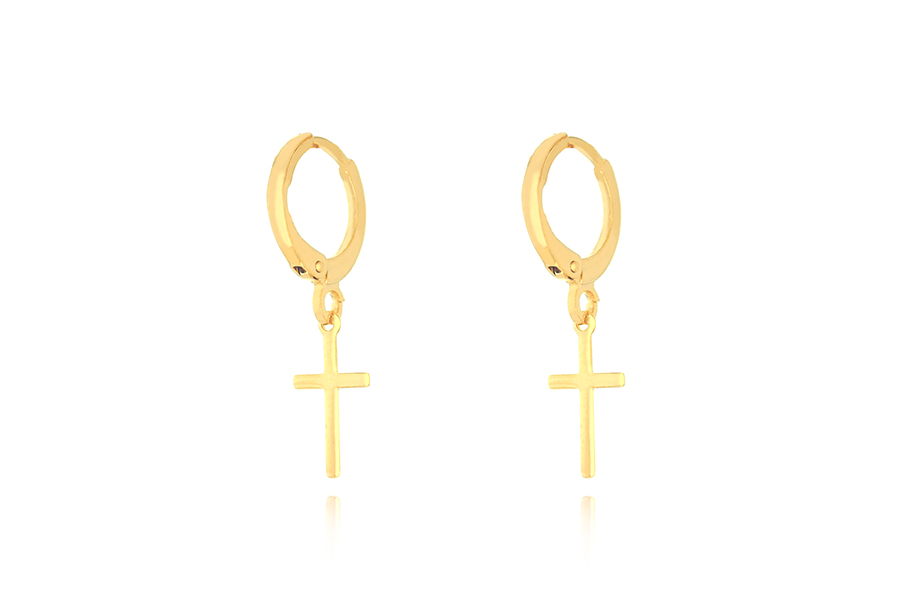 BRINCO BANHADO EM OURO, ARGOLINHA E CRUZ 13mm COMPRIMENTO
